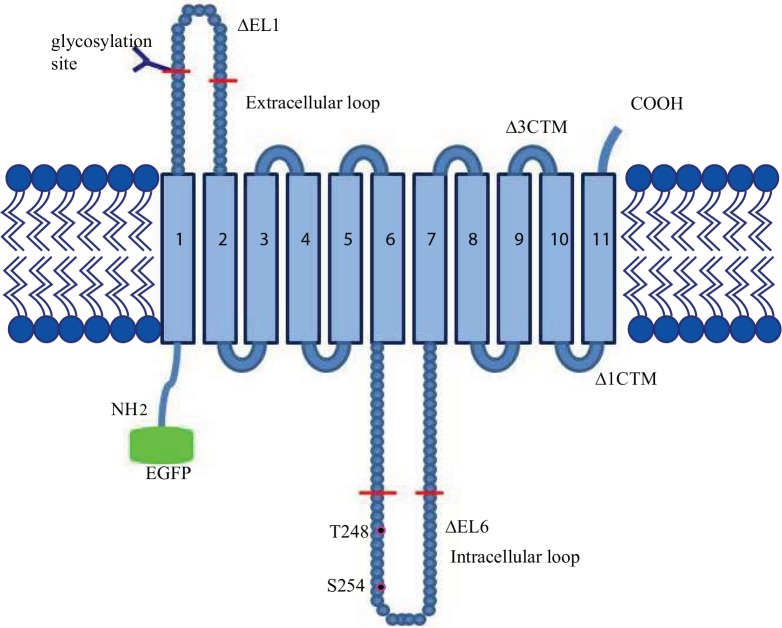 Fig 1. Structure of hENT1 with deletions and mutations.Shown is the predicted topology of hENT1 with the cytoplasmic amino-terminus, 11 TMs and short extracellular carboxyl-terminus. Red bars show the beginnings and the ends of the deleted regions in the extracellular, âEL1, and intracellular, âIL6, loops and the beginnings of the deletions at the carboxyl-terminus, â3CTM and â1CTM. The predicted CK2 phosphorylation sites, Thr 248 and Ser 254, are marked in magenta. EGFP was fused to the amino-terminus.