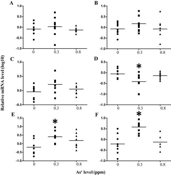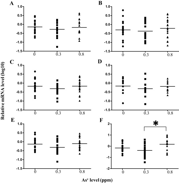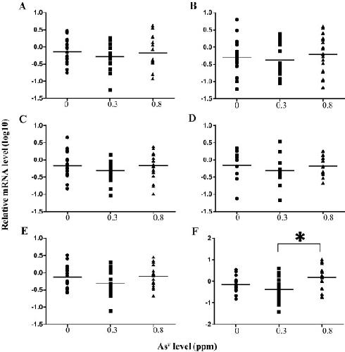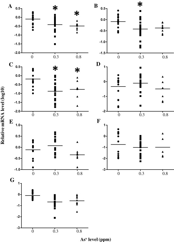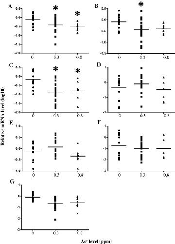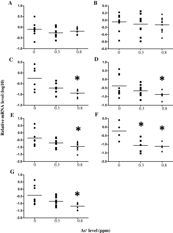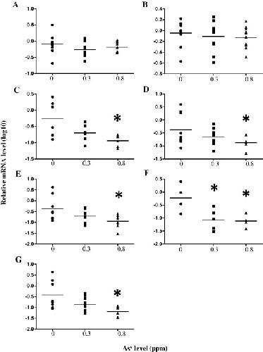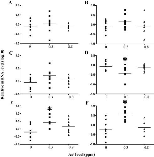 Arsenic contaminates water surface and groundwater worldwide. Several studies have suggested that arsenic acts as an endocrine disruptor in mammalian and non-mammalian species, although its chronic effect during development remains largely unknown. To address this question, life cycle exposures to 0, 0.3 and 0.8ppm of arsenate (pentavalent arsenic; As(V)) were performed in the Western clawed frog (Silurana tropicalis) from the gastrulae stage (developmental stage Nieuwkoop-Faber; NF12) until metamorphosis (NF66). Tissue samples were collected at the beginning of feeding (NF46; whole body), sexual development (NF56; liver), and at metamorphosis completion (NF66; liver and gonadal mesonephros complex). Real-time RT-PCR analysis quantified decreases in mRNA levels of genes related to estrogen- (estrogen receptor alpha and aromatase), androgen- (androgen receptor and steroid 5-alpha-reductase type 2), and cholesterol metabolism- (steroidogenic acute regulatory protein) at stage NF46. Similarly, arsenate decreased steroid 5-alpha-reductase type 2 expression in stage NF56 livers, but transcript increases were observed for both estrogen receptor alpha and steroidogenic acute regulatory protein at this stage. Given the changes observed in the expression of genes essential for proper sexual development, gonadal histological analysis was carried out in stage NF66 animals. Arsenate treatments did not alter sex ratio or produce testicular oocytes. On the other hand, arsenate interfered with thyroid hormone-related transcripts at NF66. Specifically, thyroid hormone receptor beta and deiodinase type 2 mRNA levels were significantly reduced after arsenate treatment in the gonadal mesonephros complex. This reduction in thyroid hormone-related gene expression, however, was not accompanied by any morphological changes measured. In summary, environmentally relevant concentrations of As(V) altered steroidogenesis-, sex steroid signaling- and thyroid hormone-related gene expression, although transcriptional changes varied among tissues and developmental stages.