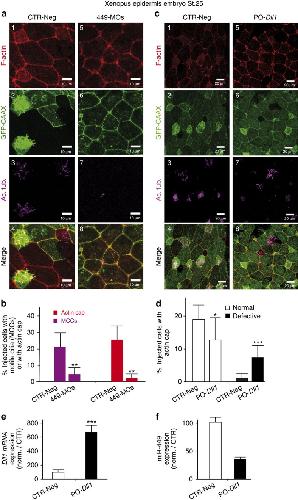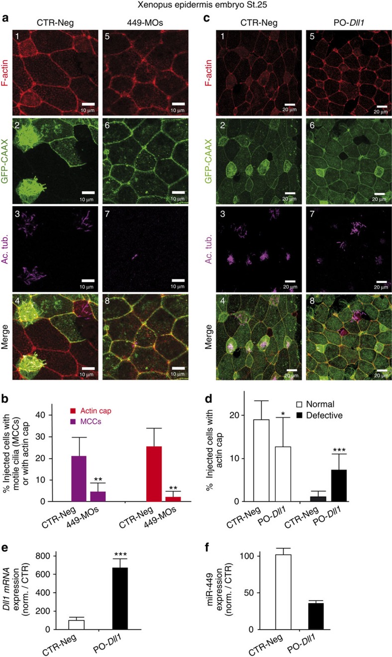 Figure 2. MiR-449 affects actin network remodelling and multiciliogenesis in Xenopus epidermis.(aâd) The epidermis precursor blastomeres (eight-cell stage Xenopus embryos) were injected with negative control morpholinos (CTR-Neg) (a,c), with morpholinos against miR-449 (449-MOs) (a,b) or with protector morpholinos of Dll1 (PO-Dll1) (c,d). Staining at stage 25 for F-Actin (in red, a1,5 and c1,5) and motile cilia (Ac. Tub. in magenta, a3,7 and c3,7). Injected cells were detected by the expression of a synthetic mRNA coding for membrane-bound GFP (GFP-CAAX in green, a2,6 and c2,6). (b) The histogram indicates the percentage of GFP-CAAX-positive injected cells that develop motile cilia or apical actin cap in controls (Stage 24+25: n=5 fields/583 injected cells) and in miR-449 morphants (Stage 24+25: n=8 fields/625 injected cells; P-value st.24+25=0.0087; MannâWhitney test with two-tailed P-value). (d) Percentage of injected cells positive for GFP fluorescence with normal or defective actin cap in control (n=30 fields per 1,345 injected cells) versus PO-Dll1 morphants (n=32 fields per 1,268 injected cells; P-value (normal versus defective in control) st.24+25 <0.0001, P value (normal versus defective in PO-Dll1-injected st.24+25=0.0033; MannâWhitney test with two-tailed P-value). (e) Effect of protecting the Dll1 mRNA from the interaction with miR-449 (PO-Dll1) in Xenopus epidermis on Dll1 expression (normalized with ornithine decarboxylase (ODC)). (f) Effect of PO-Dll1 in Xenopus epidermis on miR-449 expression, normalized with U6. Data are means±s.d. of two independent experiments. |