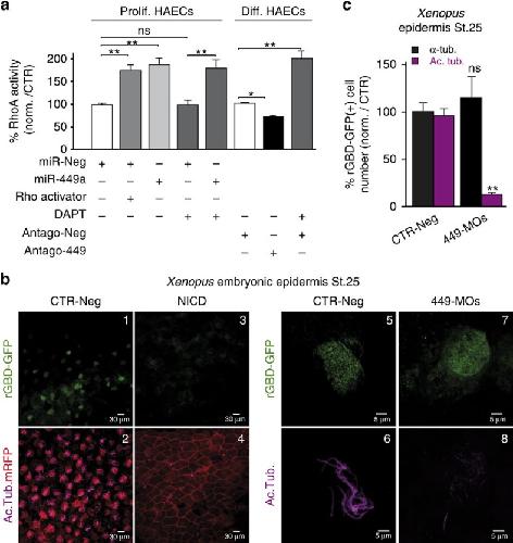 Figure 3. miR-449 controls small GTPase pathways during MCC differentiation.(a) Left (Prolif. HAECs): RhoA activity in proliferating HAECs transfected for 72 h with miR-Neg, miR-449a and/or incubated with DAPT (10 μM) or a Rho activator (calpeptin, 1 U ml−1, 2 h). Right (Diff. HAECs): RhoA activity in differentiating HAECs at Po stage treated for 72 h with antago-Neg, antago-449 or DAPT (10 μM). RhoA activity is expressed as a percentage relative to control. Data are mean±s.d. from at least three independent experiments (*P<0.05, **P<0.01 and ***P<0.001; Student's t-test). (b) RhoA activity in Xenopus epidermis at stage 25, assessed by measuring the fluorescence of rhotekin rGBD-GFP, an active RhoA sensor (green, upper panels). Injected cells are identified by the membrane-bound RFP (mRFP in red, lower panels). Cells were either untreated (CTR-Neg, b1,2,5,6), injected with miR-449 morpholinos (449-MOs, b7,8) or with Notch intracellular domain NICD (b3–4). Motile cilia's staining is in magenta (lower panels). (c) The histogram indicates the percentage of rGBD-GFP-positive cells stained for α-tubulin mRNA (α-Tub. in black) or acetylated tubulin (Ac. Tub. in magenta) in miR-449 morphants (449-MOs, n=68) relative to negative control (n=110). Data are mean±s.e.m. (**P<0.005, ns, not significant, one-way analysis of variance with Dunnett's test). |