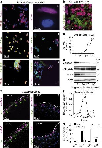 Figure 5. Cellular specificity of expression of ARHGAP1, ARHGDIB and R-Ras during MCC differentiation.(a,b) Fluorescence immunocytochemistry experiments on cytospins from dissociated HAECs (a1â6) and primary HAEC cultures at LC step (b) illustrate the cell-specific expression of human ARHGDIB (in green, a5â6,b) and R-Ras proteins (in green, a3,4). Basal and ciliated cells are CD151+ (in red, a1,3,5) or acetylated tubulin+ (in magenta a2,4,6 and b), respectively. Panel a2 is a magnification of an isolated acetylated tubulin-positive MCC. HAECs are stained for nuclei with 4,6-diamidino-2-phenylindole (DAPI; in blue, a1â6), F-Actin with phalloidin (in red, b). Expression levels of miR-449a (c) and of ARHGAP1, ARHGDIB and R-Ras proteins (d) during HAEC differentiation. MiR-449 levels are normalized with RNU44 (c) and HSP60 was used as a loading control (d). (e) FISH analysis of rras (e1,2) and arhgap1 (e3,4) mRNA on sections of Xenopus embryonic epidermis at stages 16 and 19 (e1,2) or at stages 17 and 20 (e3,4). MCC precursors are positive for α-tubulin (magenta; e1â4). DAPI staining is in blue and white dotted lines indicate the surface of the outer layer. (f) Real-time RTâPCR of rras transcripts in Xenopus epidermis performed at each corresponding stages indicted in the figure. (g) Transcript levels of rras decrease concomitantly with the induction of miR-449 expression. Transcript levels of rras and miR-449 were normalized and compared with their respective values obtained in stage 13. Transcript levels of rras were normalized against Odc transcript as an internal control and miR-449 expression was normalized with U2 as an internal control. Data represent the mean and s.d. of three independent experiments (***P<0.001, **P<0.01 and *P<0.05; Student's t-test). |
