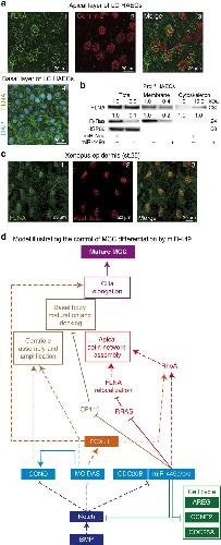 Figure 8. MiR-34/449 promote FLNA relocalization during MCC differentiation.(a) Apical layer of differentiated HAECs (LC stage) were stained for the basal bodies marker centrin-2 (in red) and the actin-binding protein filamin-A (FLNA, in green). FLNA labelling was enriched in the apical layer near basal bodies (a1â3). Basal layer of differentiated HAECs (LC stage) were stained for FLNA (in green) and for nuclei with 4,6-diamidino-2-phenylindole (DAPI; in blue) (a4). (b) Modulation of protein levels of FLNA and R-Ras in total fraction (Total), membrane fraction (Membrane) and cytoskeletal fraction (Cytoskeleton) isolated from proliferating HAECs transfected for 72âh with miR-Neg or miR-449a as indicated each below corresponding band. Protein levels were normalized against HSP60 as an internal control for the total fraction and normalized fold changes are indicated above the corresponding bands. Data were representative of three independent experiments. (c) In the epidermis of stage 25 Xenopus embryos, FLNA labelling (in green, c1) is apically enriched in acetylated tubulin-positive MCCs (in magenta, c2,3). (d) Model illustrating the roles of miR-449 and other interconnected actors in MCC differentiation. Early cues required to trigger MCC differentiation involve the inhibition of BMP and Notch pathway. The expression of Multicilin (MCIDAS), CCNO and miR-449 is controlled by the Notch pathway activity. Notch repression is associated with the increase in MCIDAS, CCNO and miR-449 expression. Then, miR-449 miRNAs repress the Notch pathway inducing a double-negative feedback loop increasing miR-449 expression. MiR-449 inhibit cell cycle-related genes to stop proliferation and promote entry in differentiation. In addition, MCIDAS drives expression of centriole multiplication-related genes including CCNO, which then participates to centriole assembly and amplification. MCIDAS also contributes to increase FOXJ1 expression, which in turn controls ciliogenesis-related genes and apical actin remodelling through a RhoA-dependent mechanism. In parallel, miR-449 also control apical actin network remodelling by repressing R-Ras, promoting FLNA redistribution and modulating RhoA activity. Finally, miR-449 favour basal body maturation and anchoring by downregulating CP110. All these events are key pre-requisites for axoneme elongation and motile cilia formation during MCC differentiation. Plain lines indicate direct interactions; dotted lines identify pathways that may or may not be direct. |