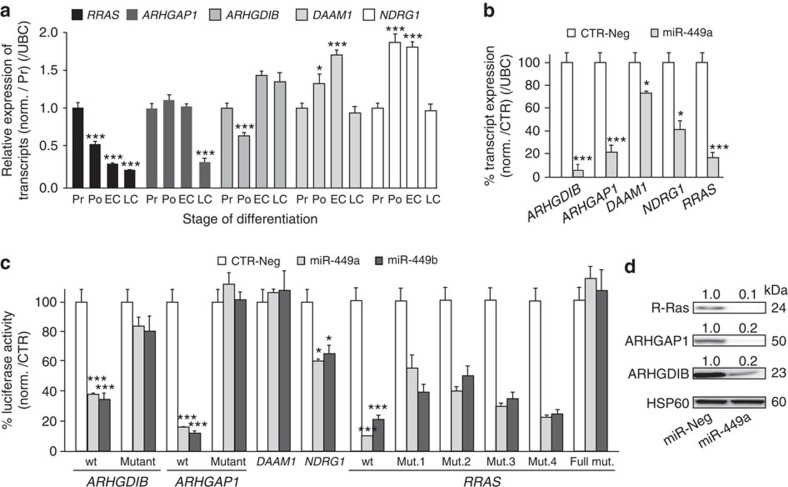 Figure 4. ARHGAP1, ARHGDIB and RRAS are targeted by miR-449 in HAECs.(a,b) Transcript expression levels of ARHGAP1, ARHGDIB, DAAM1, NDRG1 or RRAS were analysed using real-time RT–PCR during HAEC differentiation (a) or following miR-449a overexpression (48 h) in proliferating HAECs (b), and normalized with UBC transcript as an internal control. (c) Specific interaction between miR-449a/b and the 3′-UTRs of ARHGAP1, ARHGDIB, DAAM1, NDRG1 and RRAS mRNAs was assessed using luciferase reporter assay on constructs carrying either the wild-type (wt) or mutants (mut.) 3′-UTR-binding sites for miR-449. Values were normalized with the internal Renilla luciferase control. (d) Detection of ARHGAP1, ARHGDIB and R-Ras proteins after miR-449 overexpression in proliferating HAECs for 72 h. HSP60 is used as an internal control. Quantification of protein levels are indicated above each corresponding band. All data are means±s.d. of at least three independent experiments (***P<0.001, **P<0.01 and *P<0.05; Student's t-test). |