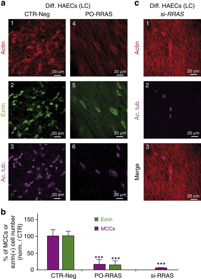 Figure 6. The direct repression of RRAS by miR-449 affects multiciliogenesis and apical actin cytoskeleton reorganization in HAECs.(a) Differentiating HAECs were chronically treated with negative oligonucleotide (CTR-Neg, a1â3) or with an oligonucleotide protecting the miR-449-binding site on RRAS (PO-RRAS, a4â6) and stained at LC stage for F-actin (a1,4), ezrin (a2,5) and acetylated tubulin (Ac. Tub., a3,6). (b) Alternatively, differentiating HAECs were transfected at seeding time with si-RRAS and stained at LC stage for F-actin (in red, c1) and motile cilia (Ac. Tub. in magenta, c2). (c) The histogram indicates the number of apical ezrin-positive cells (in green) and MCCs (in magenta) normalized in percentage from control. Protecting the RRAS mRNA from interaction with miR-449 leads to defects in apical actin reorganization together with a decrease in MCC differentiation similar to that observed after inhibition of miR-449 activity. All data are means±s.d. from at least three independent experiments (***P<0.001; Student's t-test). |