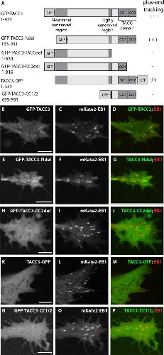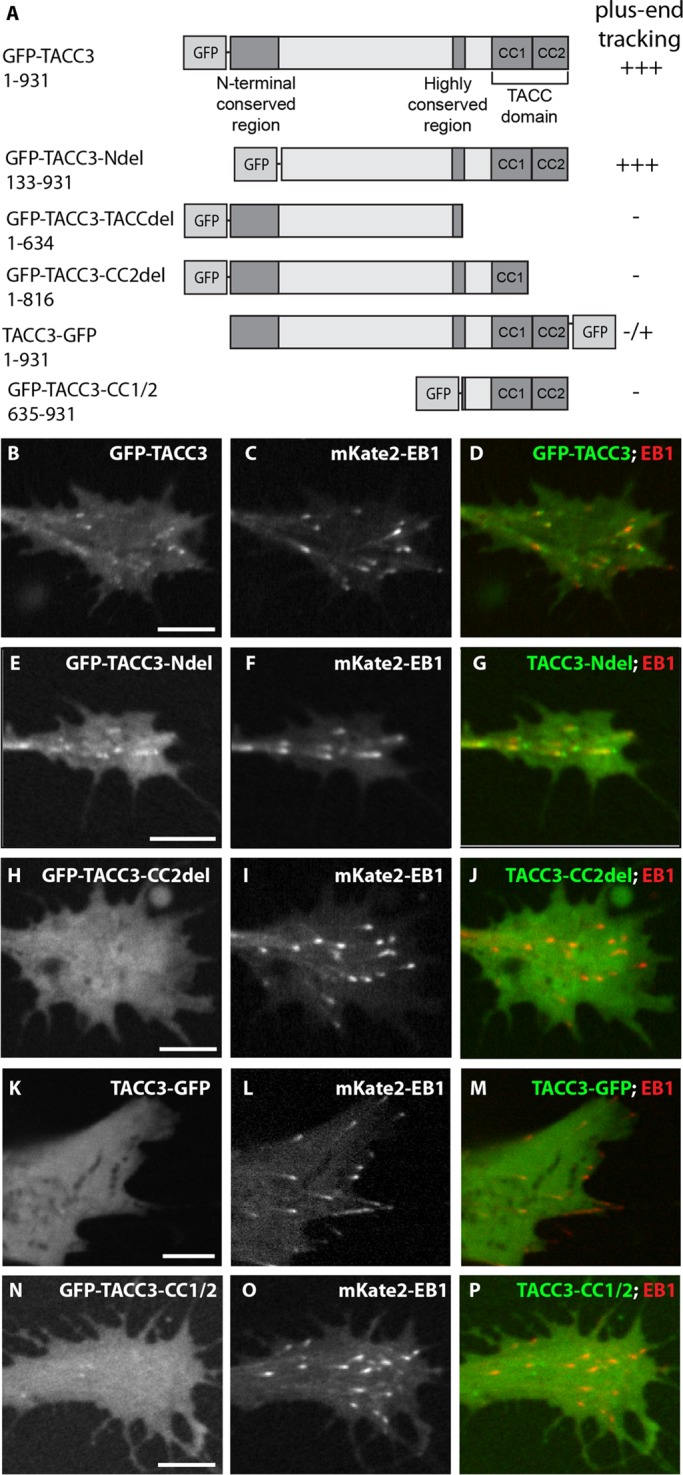 FIGURE 5:. The TACC domain is necessary but not sufficient for MT plus end tracking by TACC3. (A) Schematic representation of GFP-tagged TACC3 proteins and deletion constructs, and designation of whether the protein tracks along growing MT plus ends. The amino acid residue numbers refer to those in full-length X. laevis TACC3 from GenBank accession number NP_001081964.1. Conserved domains of TACC3 include an N-terminal, conserved region, a C-terminal, highly conserved TACC domain, and a short, highly conserved region, which is located before the TACC domain. The TACC domain consists of two coiled-coil (CC) domains, CC1 and CC2. The TACC domain is necessary for localization to the centrosome (Gergely et al., 2000b; Peset et al., 2005) and interaction with XMAP215 family members (Lee et al., 2001; Thakur et al., 2014). (B–M) Expression of GFP-tagged TACC3 constructs (B, E, H, K, N), mKate2-EB1 (to identify MT plus ends; C, F, I, L, O), and merged images of both channels (D, G, J, M, P). Plus end accumulation is apparent in B and E but not H, K, or N. Images in K–M are from the edge of a neural crest cell, whereas all others are growth cones. See Figure 5 Supplemental Movies 1–5. Bar, 5 μm. |