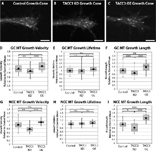 FIGURE 2:. TACC3 regulates MT dynamics in X. laevis growth cones and neural crest cells. (A–C) Representative micrographs of EB1-GFP comets in control (A), TACC3 KD (B), and TACC3 OE (C) conditions. See Figure 2 Supplemental Movies S1–S4. Bar, 5 μm. (D–F) Quantification of MT growth track parameters in cultured embryonic neuronal growth cones (GC) after TACC3 manipulation. EB1-GFP localizes to the ends of growing MTs and is thus a marker for MT polymerization. Automated tracking of EB1-GFP comets calculate MT growth-track velocity (D), MT growth-track lifetime (E), and MT growth-track length (F). Examples of actual mean values for a single experiment: GC MT velocity, control, 6.4 μm/min; TACC3 KD, 5.7 μm/min; TACC3 OE, 7.1 μm/min. GC MT lifetime, control, 12.6 s; KD, 13.3 s; OE, 14.1 s. GC MT length, control, 1.4 μm; KD, 1.3 μm; OE, 1.7 μm. NCC MT velocity, control, 7.5 μm/min; KD, 6.0 μm/min; OE, 8.5 μm/min. NCC MT lifetime, control. 11.4 s; KD. 13.0 s; OE, 12.1 s. NCC MT length, control, 1.3 μm; KD, 1.3 μm; OE, 1.8 μm. For each independent experiment (six were performed in total), measurements of MT parameters were normalized to their respective experimental control means due to the significant day-to-day fluctuations in control MT dynamics (in part, due to room temperature changes). Control data represent the means of 44 growth cones, representing a total of 1228 analyzed tracks; TACC3 KD represents 49 growth cones with 964 tracks; TACC3 OE represents 24 growth cones with 524 tracks. (G–I) Quantification of MT growth-track parameters in cultured embryonic neural crest cells. Control data represent the means of 20 neural crest cells, representing a total of 2876 analyzed tracks; TACC3 KD represents 13 cells with 1313 tracks; TACC3 OE represents 10 cells with 1386 tracks. Box-and-whisker plots indicate the mean (diamond), median, extrema, and quartiles. An unpaired t test was performed to assess significance between conditions. *p < 0.05, **p < 0.01, ***p < 0.001; ns, not significant. |