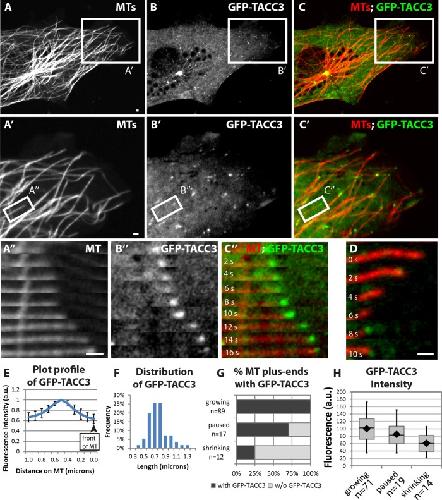 FIGURE 4:. TACC3 can act as a +TIP in nonneuronal embryonic cells. (AâC) Expression of mKate2-tubulin (A), GFP-TACC3 (B), and merge (C) in cultured fibroblasts derived from embryonic somitic mesoderm. See Figure 4 Supplemental Movie 1. (Aâ²âCâ²) Magnified views of the boxed regions in AâC. See Figure 4 Supplemental Movie 2. (Aâ²â²âCâ²â²) Magnified time-lapse montages of the boxed regions in Aâ²âCâ². (D) Time-lapse montage of another MT in the process of undergoing catastrophe, with GFP-TACC3 localizing. (E) Fluorescence intensity profile of line-scan average from 43 MT plus ends. (F) Histogram depicting the distribution of lengths of detectable GFP-TACC3 localization on the plus ends of MTs. (G) Percentage of MT plus ends with GFP-TACC3 localization for different MT dynamics instability states. (H) Quantification of mean fluorescence intensity of 4 à 4 pixel square of GFP-TACC3 accumulation on the ends of MTs, when visible. Box-and-whisker plots indicate the mean (diamond), median, extrema, and quartiles. Bar, 1 μm. |