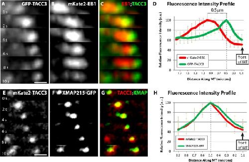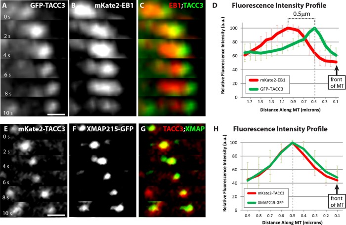 FIGURE 6:. TACC3 localization on MT plus ends is more distal than EB1 and overlaps with XMAP215. (AâC) Representative time-lapse montage of GFP-TACC3 (A) and mKate2-EB1 (B) accumulation on growing MT plus end. MT is growing to the right. Merged image (C) highlights the spatial arrangement between GFP-TACC3 and mKate2-EB1 localizations. These images were compiled by translating the TACC3 channel on the x-axis, after calculating the frame-to-frame velocity of the growing MT plus end, in order to account for the 1-s time delay between channels, for each examined MT (using ImageJ Translate function). To further confirm correct translation, uncorrected time-lapse colocalizations were examined with both combinations of imagingâred channel first, green channel second; then green channel first, red channel second. (D) Fluorescence intensity profiles of GFP-TACC3 and mKate2-EB1. GFP-TACC3 and mKate2-EB1 signals from 12 individual MTs were quantified by intensity line scans to present the relative fluorescence intensity profiles, with the plus end of the MT toward the right. The highest-intensity peak of GFP-TACC3 is â¼0.5 μm distal to the peak of mKate2-EB1. (EâG) Representative time-lapse montage of mKate2-TACC3 (E) and XMAP215-GFP (F) accumulation on growing MT plus end. MT is growing to the right. Merged image (G) shows that mKate2-TACC3 and XMAP215-GFP localizations overlap. (H) Fluorescence intensity profiles of mKate2-TACC3 and XMAP215-GFP. mKate2-TACC3 and XMAP215-GFP signals from 11 individual MTs were quantified by intensity line scans to present the relative fluorescence intensity profiles. Note that peak intensities of mKate2-TACC3 and XMAP215-GFP closely align. Bar, 0.5 μm. |