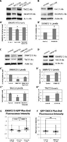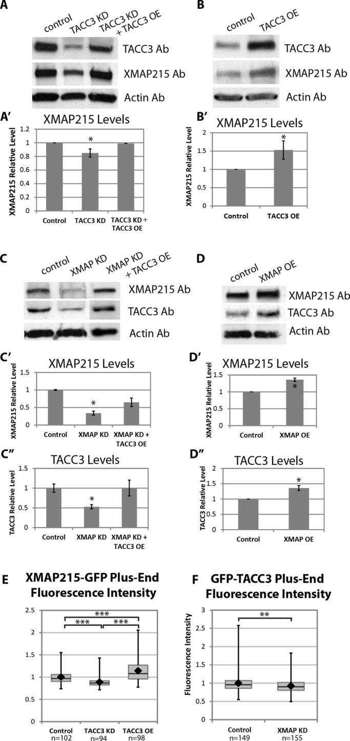 FIGURE 7:. TACC3 and XMAP215 levels affect each other's protein stability and localization to MT plus ends. (A, B) Representative Western blots showing levels of TACC3 and XMAP215 after TACC3 KD (A) or overexpression (B). The graphs in Aâ² and Bâ² are compilations of seven and six individual Western blot experiments, respectively. (C, D) Representative Western blots showing levels of XMAP215 and TACC3 after XMAP215 KD (C) or overexpression (D). The graphs in Câ² and Câ²â² are from six Western blot experiments, and Dâ² and Dâ²â² are from three experiments. Bars in graphs of Western densitometry denote SE. A KruskalâWallis test was performed to assess significance of differences in Western blot densitometry. *p < 0.05. (E) Quantification of fluorescence intensity levels of XMAP215-GFP on MT plus ends in control, TACC3 KD, and TACC3 OE conditions, normalized to cytoplasmic levels. Data represent analysis of â¼100 individual MTs from numerous growth cones for each condition. (F) Quantification of fluorescence intensity levels of GFP-TACC3 on MT plus ends in control and XMAP215 KD conditions, normalized to cytoplasmic levels. Data represent analysis of 149 and 151 individual MTs from numerous growth cones per condition. Box-and-whisker plots indicate the mean (diamond), median, extrema, and quartiles. An unpaired t test was performed to assess significance between conditions. **p < 0.01, ***p < 0.001; ns, not significant. |