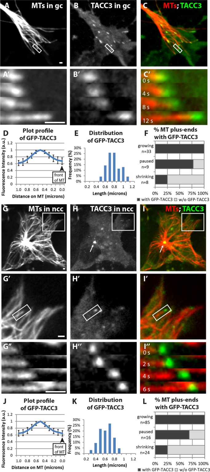 FIGURE 3:. TACC3 can act as a +TIP in neuronal growth cones and neural crest cells. (A–C) Expression of mKate2-tubulin (A), GFP-TACC3 (B), and merge (C) in living growth cone (gc). See Figure 3 Supplemental Movie 1. (A′–C′) Magnified time-lapse montages of the boxed regions in A–C shows that GFP-TACC3 localizes to growing MT plus ends. (D) Fluorescence intensity profile of line-scan average from 30 MT plus ends in growth cones. (E) Histogram depicting the distribution of lengths of detectable GFP-TACC3 localization on the plus ends of MTs in growth cones. (F) Percentage of MT plus ends with GFP-TACC3 localization for different MT dynamics instability states. (G–I) Expression of mKate2-tubulin (G), GFP-TACC3 (H), and merge (I) in living neural crest cell (ncc). See Figure 3 Supplemental Movie 2. (G′–I′) Magnified views of the boxed regions in G–I. See Figure 3 Supplemental Movie 3. (G′′–I′′) Magnified time-lapse montages of the boxed regions in G′–I′. (J) Fluorescence intensity profile of line-scan average from 45 MT plus ends in neural crest cells. (K) Distribution of lengths of detectable GFP-TACC3 localization on the plus ends of MTs. (L) Percentage of MT plus ends with GFP-TACC3 localization for different MT dynamics instability states. Bar, 1 μm. |
