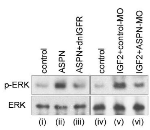 Figure S4. Both IGF and ASPN are required for the full activation of ERK. Animal cap explants were prepared from 3 ng control ï¢-Galactosidase (i,ii,iv), 3ng dnIGFR mRNA (iii), 20 ng control-MO (v) or 20 ng ASPN-MO (vi) injected embryos and were incubated with the conditioned media expressing control (i,iv), ASPN (ii,iii) or IGF2 (v,vi) for 20 minutes. The explants were analysed by western blotting using phosphor-ERK or ERK antibodies. |