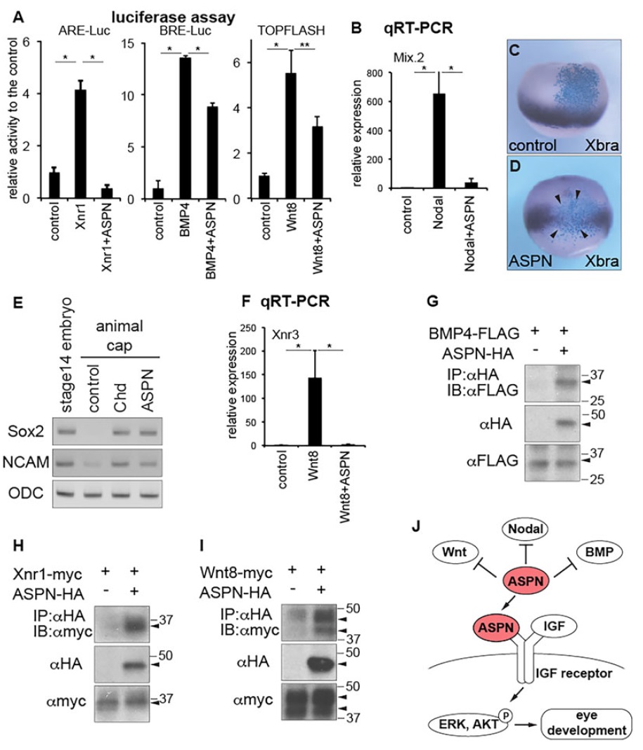 analysed at stage 10.5. (G-I) ASPN forms complexes with BMP4