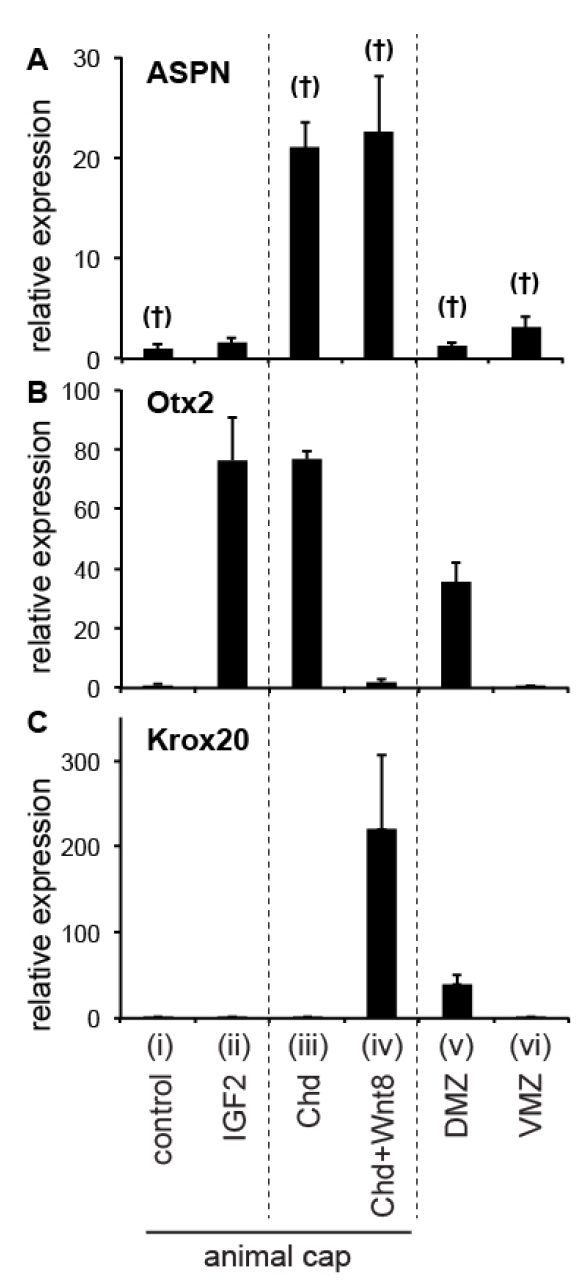 Figure S1. Expression of ASPN and other related genes in various explants. Expression levels of ASPN (A), Otx2 (B) and Krox20 (C) in various types of explants, as assayed by qRT-PCR. Animal caps (control (i) or injected with mRNAs of 500 pg IGF2 (ii), 500 pg Chd (iii) or 500pg Chd + 100 pg Wnt8 (iv)) and dorsal marginal zone (DMZ; v) and ventral marginal zone (VMZ; vi) were prepared at stage 10.5 and assayed at stage 18. Note that the data indicated with (â ) are identical to those in Fig.1H. |