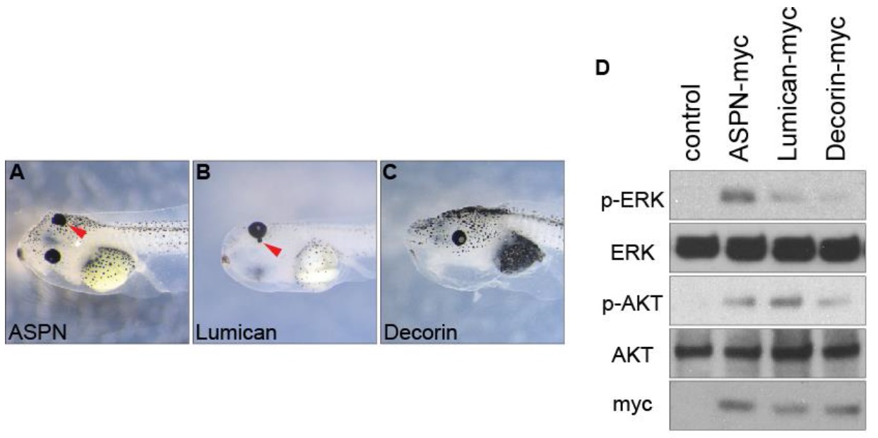 Figure S2. Characterisation of Lumican and Decorin. (A-C) Representative images of the embryos injected with 3 ng ASPN (A), 3 ng Lumican (B) and 3 ng Decorin (C) mRNAs. (D) Differential activation of ERK and AKT by SLRP proteins. Control (i), ASPN-myc (ii), Lumican-myc (iii) or Decorin-myc (iv) expression media were prepared and applied onto HEK293 cells as in Fig. 5A. |