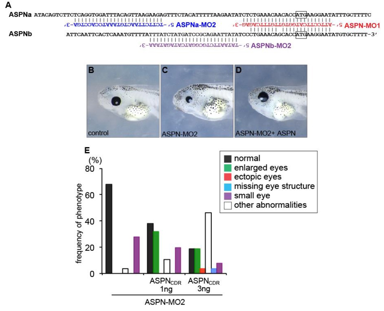 Figure S3. Designation of morpholino oligonucleotides against ASPN and the phenotypes caused by the ASPN-MO2. (A) In addition to ASPNa, which this study is based on, we found another genome sequence probably due to the pseudotetraploidity, and termed it ASPNb. The nucleotide sequences (black characters) around the start codon (circled) of Xenopus ASPN and the sequences of ASPN-MO1 (red) ASPNa-MO2 (blue) and ASPNb-MO2 (purple) are shown. (B-D) Representative images from the injection of 20 ng control-MO (B), 20 ng ASPN-MO2 (C) and 20ng ASPN-MO2 together with 1 ng of the coding region of ASPN (ASPNCDR) mRNA (D). (E) Quantification of the phenotypes. For the rescue experiment embryos were injected with either 20 ng ASPN-MO2 and 1 ng ASPNCDR, or 20 ng ASPN-MO2 and 3 ng ASPNCDR and the phenotypes analysed at stage 41. |