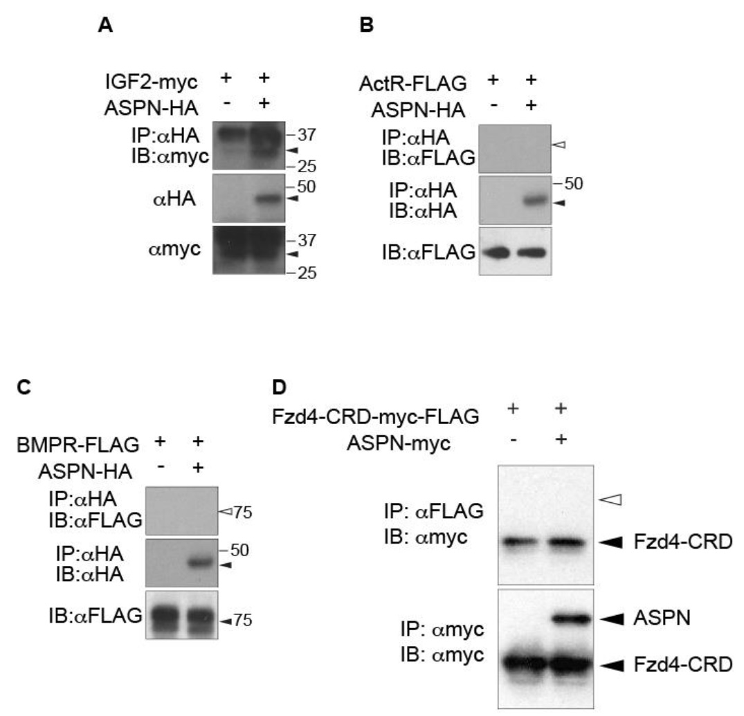 Figure S5 Interactions between ASPN and other molecules. The expression plasmids encoding ASPN-HA, IGF2-myc (A), Activin receptor (ActR)-FLAG (B), BMP receptor (BMPR)-FLAG (C) and Fzd4-CRD (the cysteine-rich domain in the extracellular part of Frz4)-myc-FLAG (D) were transfected as in Fig. 6G-I. The cell extracts were analysed by coimmunoprecipitation assays. |