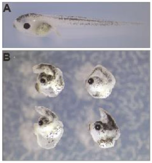 Figure S6. The phenotypes caused by the ventral injection of ASPN mRNA. 3 ng of ASPN mRNA was injected at the equator regions of one of the blastomeres at 4-cell stage and the phenotype observed at stage 42. In contrast to the control embryos (A), the injected embryos exhibited shortened bodies (B).