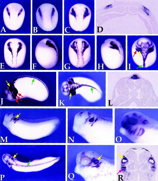 Fig. 2. Developmental expression of Sox10 by whole-mount in situ hybridization. (A) Sox10 expression at the neurula stage (stage 14) is detected at the lateral edges of the neural plate. Slug (B) and Sox9 (C) expression at a similar stage are shown for comparison. (AâC) Dorsal views, anterior to top. (D) Transverse section of a stage 14 embryo. Sox10 expression is restricted to the neural crest-forming region. (EâH) Stage 16 embryo, dorsal (E, G) or lateral (F, H) views, anterior to top. As the neural tube closes, Sox10 (E, F) remains strongly expressed in the neural crest at all axial levels. Sox9 expression (G, H) is shown for comparison. (I) At stage 22, Sox10 is detected in migrating cranial neural crest cells (red arrow) as well as in neural crest at the dorsal midline in the trunk region (green arrow). An additional domain of expression includes the otic placode (yellow arrow). Dorsal view, anterior to top. (JâL) In stage 25 embryos, Sox10 is detected in the streams of cranial neural crest that populate the branchial arches (red arrows), in the dorsal aspect of the neural tube (green arrow) and in the otic placode (yellow arrow). Lateral (J) and dorsal (K) views, anterior to left. (L) Transverse section of a stage 25 embryo, highlights Sox10 expression in neural crest progenitors at the dorsal midline. (M-P) At stage 32, Sox10 expression is downregulated in the branchial arches but persists in the otic vesicle (yellow arrow), at the dorsal midline (green arrow), in the forebrain, and in discrete domains adjacent to the hindbrain. Lateral (M) and dorsal (P) views, anterior to left. Higher magnification view of Sox10 expression in the head (N). Sox9 expression in the head of an embryo at a similar stage is shown for comparison (O). In a lateral view of an embryo at stage 35 (Q), Sox10 is detected in the forebrain, the otic vesicle (yellow arrow), a number of cranial ganglia and in differentiating melanoblasts. (R) Transverse section at the level of the hindbrain illustrates Sox10 expression in the otic vesicle (yellow arrow) and adjacent VII/IX cranial ganglion (purple arrow).