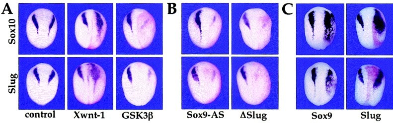 Fig. 3. Regulation of Sox10 expression in the neural crest-forming region. (A) Regulation of Sox10 and Slug expression by Wnt signaling. Injection of Xwnt-1 plasmid (100 pg) expands Slug (79%, n = 53) and Sox10 (82%, n = 50) expression domains. Conversely, overexpression of GSK3 beta (1 ng), known to block Wnt signaling, prevents Slug (81%, n = 42) and Sox10 (65%, n = 51) expression on the injected side. (B) Sox9 and Slug are required for Sox10 expression. Sox9-AS injection (10 ng) blocks Slug (89%, n = 35) and Sox10 (96%, n = 54) expression. Similarly, a dominant negative Slug (delta Slug, 1 ng) blocks Slug (61%, n = 51) and Sox10 (56%, n = 50) expression. (C) Sox9 and Slug overexpression upregulate Sox10 expression. Sox9 (1 ng) overexpression leads to a limited expansion of Slug (83%, n = 58) and Sox10 (96%, n = 79) expression domains. Overexpression of Slug (0.1 ng) results in a robust expansion of Slug (90%, n = 30) and Sox10 (98%, n = 44). In all panels, early neurula stage embryos are viewed from the dorsal side, anterior to top. RNA encoding the lineage tracer beta-galactosidase was coinjected to identify the injected side (red staining), the right side in all panels.