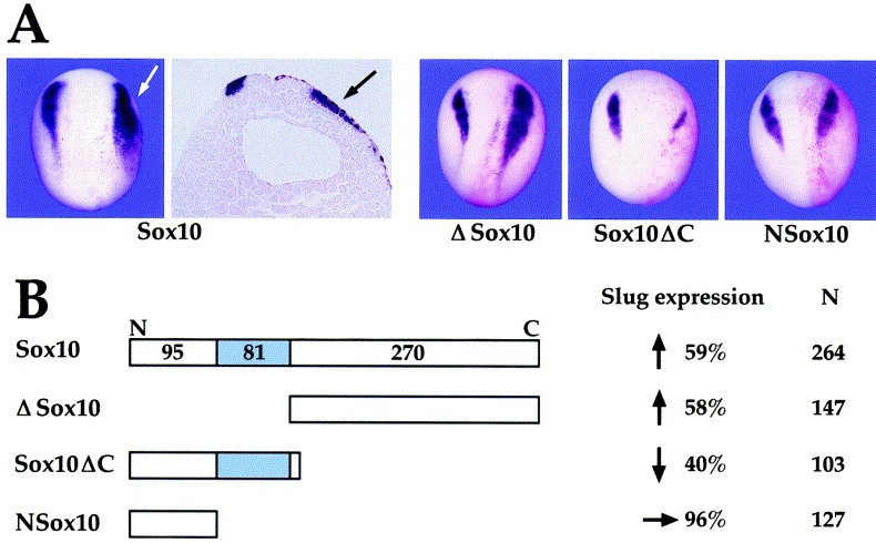 Fig. 4. The C-terminal domain of Sox10 is sufficient to induce neural crest progenitors. (A) Embryos were injected in one blastomere at the two-cell stage with mRNA encoding either wild type Sox10 (Sox10) or various Sox10 deletion constructs (Delta-Sox10, Sox10-delta-C, or Nsox10) and analyzed for Slug expression at stage 17. Sox10 injection (1 ng) expands Slug expression domain (white arrow). A transverse section through a Sox10-injected embryo illustrates Slug expansion on the injected side (black arrow). Delta-Sox10-injected embryos (1 ng) display a dramatic expansion of the Slug expression domain. By contrast, injection of Sox10-delta-C (2 ng) resulted in a moderate inhibition of Slug expression, whereas NSox10-injected embryos (1 ng) were unaffected. RNA encoding the lineage tracer beta-galactosidase was coinjected to identify the injected side (red staining), the right side in all panels. (B) Schematic representation of wild type Sox10 and various Sox10 deletion constructs. The HMG box is depicted in blue. Quantification of the in situ hybridization results. (1), expansion of Slug expression domain; (2), reduction of Slug expression domain; (3), Slug expression domain is unaffected. N, number of cases analyzed.