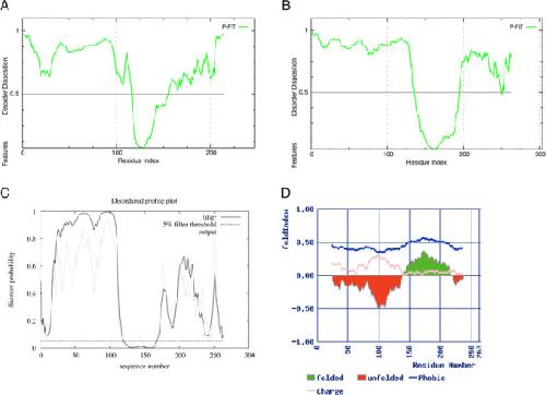 Figure 3. The terminal regions of Ngn2 are predicted to be intrinsically disordered. PONDR-FIT disorder predictions of (A) xNgn2 and (B) mNgn2. (C) DISOPRED2 and (D) FoldIndex disorder predictions of mNgn2.