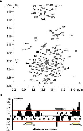 Figure 4. Annotated1H,15N 2D spectra of phosphorylated15N-mNgn2 showing altered structural positions of phosphorylated residues. (A) Detail of overlayed 2D [1H, 15N] HSQC spectra of 15N mNgn2 phosphorylated with cycA/CDK2. Resonances corresponding to phosphorylated Ser and Thr residues are labelled. (B) Secondary Structure Propensity (SSP, [46]) along the mNgn2 sequence calculated based on the available CA and CB chemical shifts (Additional file 4: Table S1). SSP scores correspond to a calculated percentage of occupancy: the 0.1/-0.1 thresholds, here represented as red lines, being empirically proposed for significance. Regions with positive values are associated with a preferential ?-helical conformation, here presented as cylinders. Regions with negative values are associated with a preferential extended conformation, here presented as arrows.