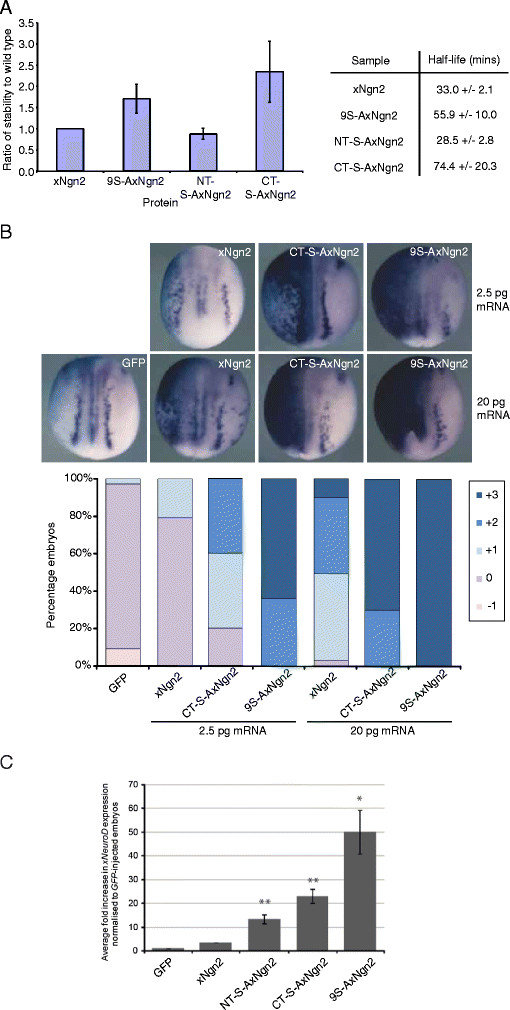Figure 1. Phosphorylation at SP sites in both the N- and C-terminal regions regulates xNgn2 activity. (A)35S-labelled IVT xNgn2, or the indicated Serine-Proline to Alanine-Proline xNgn2 mutants, full phosphomutant (9S-AxNgn2), N-terminal region (NT-S-AxNgn2) or C-terminal region (CT-S-AxNgn2), were added to Xenopus laevis mitotic egg extracts and incubated at 21°C. Samples were taken at 0, 15, 30, 45, 60, 75, 90 and 120 mins and separated on 15% SDS-PAGE gels. Gels were analyzed by quantitative phosphorimaging analysis, calculating the average stabilization relative to wild-type xNgn2 within mitotic extract. Half-lives were calculated using first-order rate kinetics, and errors calculated using the Standard Error of the Mean (SEM). (B) Embryos were injected into 1 cell of 2 cells with the indicated amount of mRNA encoding GFP, xNgn2, CT-S-AxNgn2 or 9S-AxNgn2, injected side to the left. Embryos were fixed at stage 15 and subjected to in situ hybridization for neural Ã-tubulin expression before being scored for increased neurogenesis on the injected side compared to the uninjected side on a scale of 0¿3 [38]. The experiment was performed in duplicate (n?=?17-37). (C) 1 cell-stage embryos were injected with 20 pg of mRNA encoding GFP, xNgn2, NT-S-AxNgn2, CT-S-AxNgn2 or 9S-AxNgn2, harvested at stage 15 and expression of xNeuroD analysed by qPCR (5 embryos per sample, n?=?3).