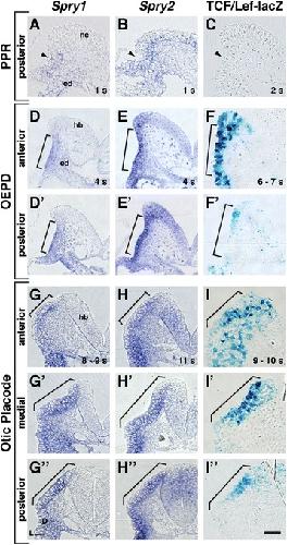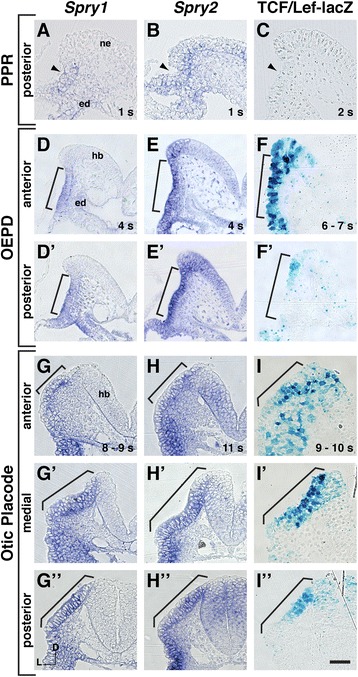 Spry1 expression, Spry2 expression, and TCF/Lef-lacZ reporter activity at early somite stages in the posterior PPR. Arrowhead indicates the presumptive otic/epibranchial region. Little or no TCF/Lef-lacZ reporter activity is detected in the posterior PPR at this stage (c). (d – f’) Spry1 expression, Spry2 expression, and TCF/Lef-lacZ reporter activity in anterior (d – f) and posterior (d’ – f’) transverse sections through the OEPD. The entire OEPD is bracketed. (g – i”) Spry1 expression, Spry2 expression, and TCF/Lef-lacZ reporter activity in anterior (g – i), medial (g’ – i’), and posterior (g” – i”) transverse sections through the otic placode (bracketed). Abbreviations: neural ectoderm (ne), endoderm (ed), hindbrain (hb). Scale bar, 50 μm
