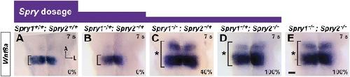 Wnt8a expression in a Spry gene dosage series. In situ hybridization analysis of Wnt8a expression in embryos in which Spry1 and Spry2 genes have been combinatorially inactivated. a – e