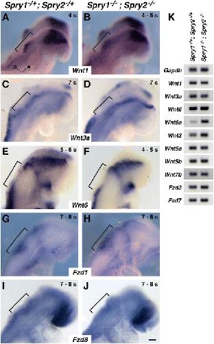 −/− embryos. a – j In situ hybridization analyses of genes encoding Wnt ligands and receptors in Spry1
