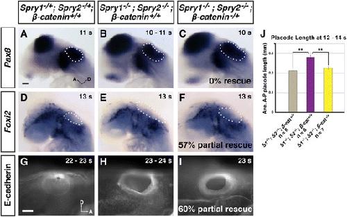â/+ embryos with partial rescue of the Foxi2 expression pattern is indicated. g â i E-cadherin antibody stain on whole-mount embryos to reveal the extent of closure of the otic cup. i A Spry1