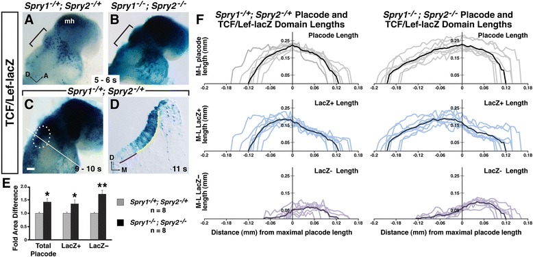 −/+ control embryo. An example of the location from which LacZ+ placode lengths were measured is shown with a yellow line. An example of the location from which LacZ- placode lengths were measured is shown with a purple line. Total placode lengths represent the sum of LacZ+ and LacZ- length measurements. e Average fold basal area difference between Spry1