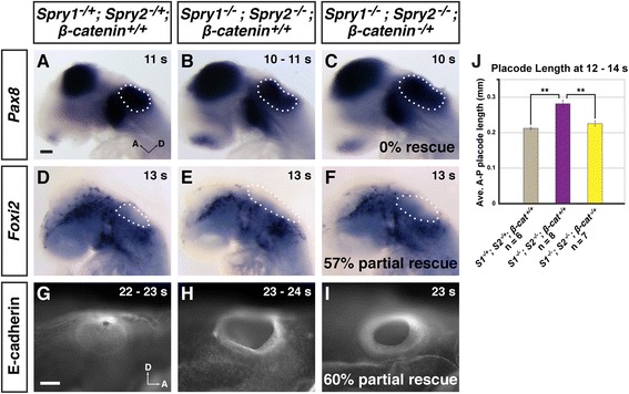 â/â mutants by reducing the dosage of β-catenin. a â c In situ hybridization analysis to detect Pax8 expression in the otic placode (outlined with white dots). c No rescue of otic placode expansions were observed in Spry1