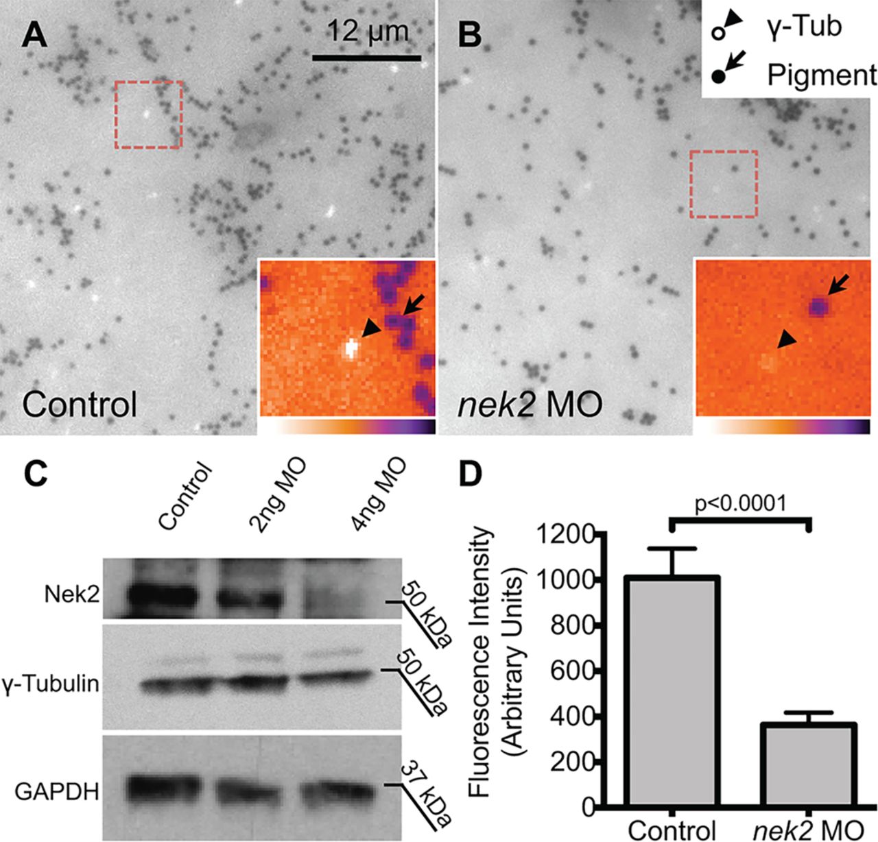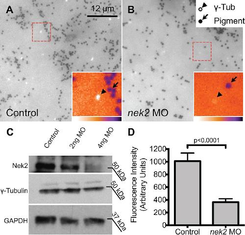 Fig. 3. There is reduced γ-tubulin incorporation into centrioles at the LRO in nek2 morphants. (A,B) Raw epifluorescent images showing LRO explants stained for γ-tubulin (light spots, arrowheads); dark spots (arrows) are pigment granules. Insets are magnifications of boxed areas false colored as heat maps. Heat map scale at bottom of inset. (C) nek2 morphants show a clear decrease in Nek2 protein levels, but do not show a decrease in γ-tubulin protein levels. (D) Quantification of the fluorescence intensity of centrioles of controls and morphants. Five centrioles from sections with comparable background fluorescence from five different embryos for each group were quantified. Error bars are s.e.m. P-values were calculated by unpaired Student's t-test. |