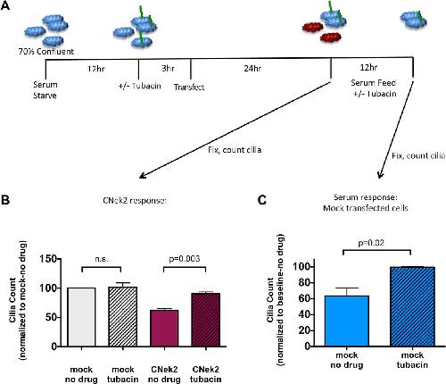 µM tubacin, transfection with Cherry-nek2, serum addition and cilia analysis. Mock transfected cells are shown in blue, Cherry-nek2 transfected cells are shown in magenta. (B) 2â