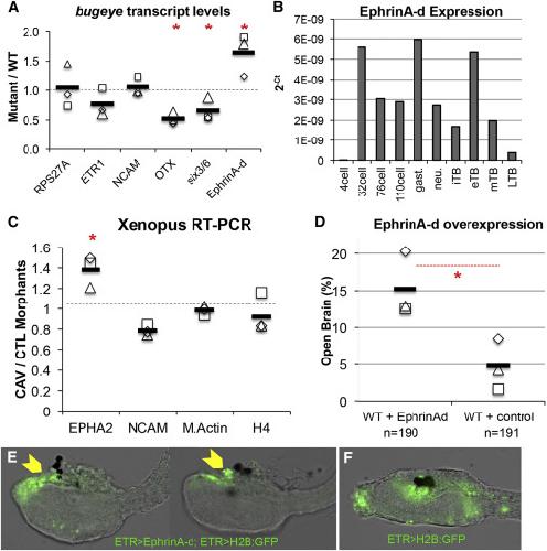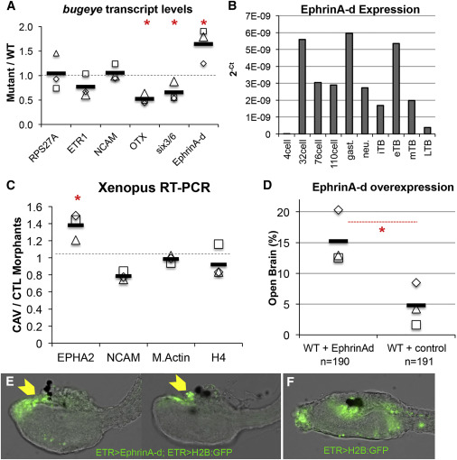 Figure 6. T-type Ca2+ Channel Regulation of EphrinA Signaling Components (A) qRT-PCR assay for expression of the neural genes etr1, otx, six3/6, NCAM, and ephrinA-d in bug and wild-type (WT) larvae. δδCT values were calculated by normalizing to the ubiquitously expressed gene RPS27A and then comparing to WT expression levels. The values for three independent biological repeats are indicated (open squares, etc.), as well as the average of the three (black bar). Red asterisks indicate significant difference between bug mutants and WT for given transcript; p ⤠0.05, t test. RPS27a values represent δCT comparison to WT. (B) C. savignyi EphrinA-d transcript levels quantified over developmental time. qRT-PCR results are represented as log2(X) changes in absolute cycle threshold values for each developmental time point sample. (C) RT-PCR for expression of EPHA2, NCAM, M.Actin, and histone 4(H4) in stage 24 X. laevis embryos were injected with either CAV3.2 splice disrupting morpholinos (CAV-MO1+2, CAV) or a control MO (CTL-MO2, CTL). The values for three independent biological repeats are indicated (open squares, etc.), as well as the average of the three (black bar). EPHA2 values are significantly different between CAV and CTL embryos (red asterisks, p = 0.025, standard t test). (D) Percentage of open brain phenotype observed in WT embryos electroporated with either the EphrinA-d cDNA expression construct (WT+ EphrinAd) or H2B:GFP cDNA (WT+ control). Results from three independent trails are shown, as well as the average of the three (black bars). Red asterisks indicate significance, p = 0.0006, Fisherâs exact test. (E) EphrinA-d overexpression driven by pan-neural ETR promoter in C. intestinalis embryos phenocopies bug. Yellow arrowheads indicate the open brain. Two representative embryos are shown. The co-electroporated plasmid ETR > H2B:GFP labels the nervous system. (F) Control embryo expressing only ETR > H2B:GFP. |