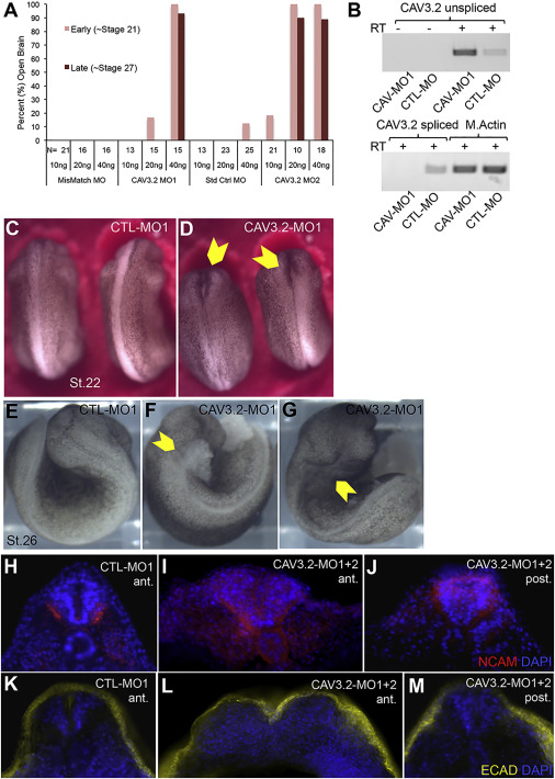 Figure 3. X. laevis CAV3.2 Morpholino Knockdown (A) Quantification of MO knockdown phenotype at stages 21 and 27. Two MOs targeting X. laevis CAV3.2 (CAV3.2-MO1 and CAV3.2-MO2) and two control MOs (mismatch [CTL-MO1] and standard control [CTL-MO2]; see Experimental Procedures) were tested. The quantities of MO injected per embryo are indicated below the number (N) of embryos scored for each dose of MO. (B) Disruption of CAV3.2 transcript splicing by CAV-MO1. RT-PCR was used to detect both the correct and expected splice-disrupted transcripts in cDNA samples from three pooled CTL-MO and three CAV-MO1-injected embryos. Muscle actin (M. Actin) RT-PCR was used to control for RNA load, and RT-minus controls are also shown. (C and D) Early tail-bud stage embryos (stage 22) injected at the one-cell stage with a CTL-MO1 (C) or a CAV3.2-MO1 (D). Yellow arrowheads in (D) indicate anterior open neural tube. (EâG) Tail-bud stage (stage 26) CTL-MO1- (E) and CAV3.2-MO1- (F and G) injected embryos. Anterior neural tube defects were observed in the CAV3.2-MO1 injections either with cellular matter erupting from the open neural tube (yellow arrowhead in F) or with a malformed head and deep dimple in the hindbrain (yellow arrowhead in G). See also Movie S2. (HâJ) NCAM staining (red) in anterior or posterior coronal sections of CTL-MO1- (H) and CAV3.2-MO1+2- (I and J) injected embryos. (KâM) E-cadherin staining (yellow) in anterior and posterior coronal sections of CTL-MO1- (K) or CAV3.2-MO1+2- (L and M) injected embryos. MO-injected embryos used for sections were stage matched at approximately stage 24 based on somite development. All sections were also stained for nuclei (DAPI, blue). |