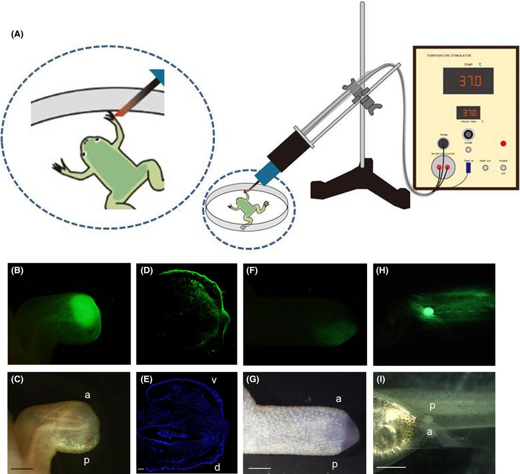 Temperature stimulator application in Xenopus laevis. (A) Schematic diagram of temperature stimulator application to a transgenic animal. An anesthetized Tg animal is locally heat-shocked by the metal probe of the temperature stimulator. (B) and (C) The most distal side of a rightforelimbblastema of an hsp70-Dkk1GFP F1 Tg froglet at 6 dpa was heat-shocked at 37°C for 10 min, and the posterior-ventral side of the same blastema was heat-shocked at 37°C for 10 min again and then photographed at 7 dpa from the ventral side. (D) and (E) A section of the blastema shown in (B) and (C) was fixed at 8 dpa and stained with anti-GFP antibody (D) and DAPI (E). (F) and (G) Posterior-dorsal side of a rightforelimbblastema of an hsp70-Dkk1GFP F1 Tg froglet at 7 dpa was heat-shocked at 37 °C for 10 min and then photographed at 8 dpa from the dorsal side. (H) and (I) A lefthindlimb bud of an hsp70-dnTead4 F1 Tg tadpole at stage 50 was heat-shocked. The upper panels (B, F, H) are fluorescent (GFP) images and the lower panels (C, G, I) are bright field images. (B, C, F, G, H, I) Scale bar = 1 mm; (D, E) Scale bar = 100 μm. a, anterior; p, posterior; d, dorsal; v, ventral.