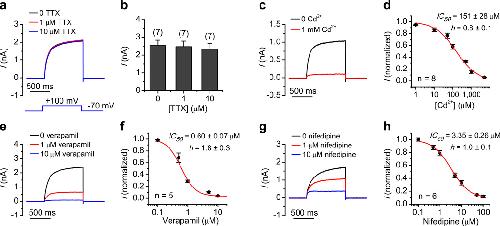 Figure 5. TPC3 is insensitive to the NaV blocker TTX but is inhibited by CaV blockersWhole-cell currents were elicited with a test pulse to +100 mV (Vh = −70 mV) and recorded under the symmetric [Na+] (150 mM in the bath and pipette) condition from GFP-drTPC3-transfected HEK293T cells. Inhibitors were added as indicated. Representative currents were recorded in the presence and absence of each drug. (a) Representative currents and (b) average current amplitudes in the presence or absence of TTX. (c) Representative currents and (d) dose response curve for Cd2+. (e) Representative currents and (f) dose response curve for verapamil. (g) Representative currents and (h) dose response curve for nifedipine. Current amplitudes normalized to that obtained without drug were fitted with the Hill equations. Data are represented as mean ± s.e.m.