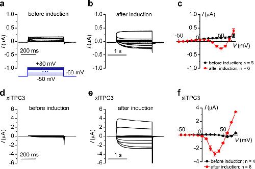 Figure 8. TPC3-like current in Xenopus oocytesTwo-electrode voltage-clamp recordings were performed with Xenopus oocytes without (a–c) or with (d–f) xlTPC3 RNA injection. (a, b, d, e) Representative currents recorded with a voltage step protocol (−50 to +80 mV with a 10-mV step, Vh = −60 mV, shown in a) before (a, d) and after (b, e) the oocyte was “induced” with a 60-s depolarization of +50 mV. Capacitive transient currents are masked for clarity. (c, f) Average current-voltage relationships. Data are represented as mean ± s.e.m.