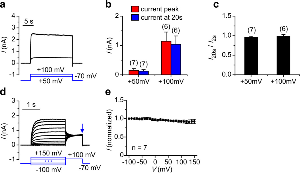 Figure 3. TPC3 channels do not inactivate(a) Representative whole-cell currents activated by 20-s-long step pulses to +50 and +100 mV (Vh = −70 mV). (b) Average amplitudes of the current peak and those at the end of pulses (20 s). (c) Current amplitudes obtained at the end of pulses normalized to those at the beginning (2 s). (d) Steady-state inactivation of TPC3. Currents were recorded with a test pulse to +100 mV following a pre-pulse of 2 s in duration, at voltages ranging from −100 to +150 mV (10-mV step). (e) Current amplitudes at the end of the test pulses (arrow in d) were plotted against pre-pulse voltages. Whole-cell currents were recorded from HEK293T cells transfected with drTPC3 (non-tagged). GFP-tagged drTPC3 generated similar non-inactivating currents (not shown; see also Fig. 2). Numbers of cells are indicated in parentheses. Data are represented as mean ± s.e.m.