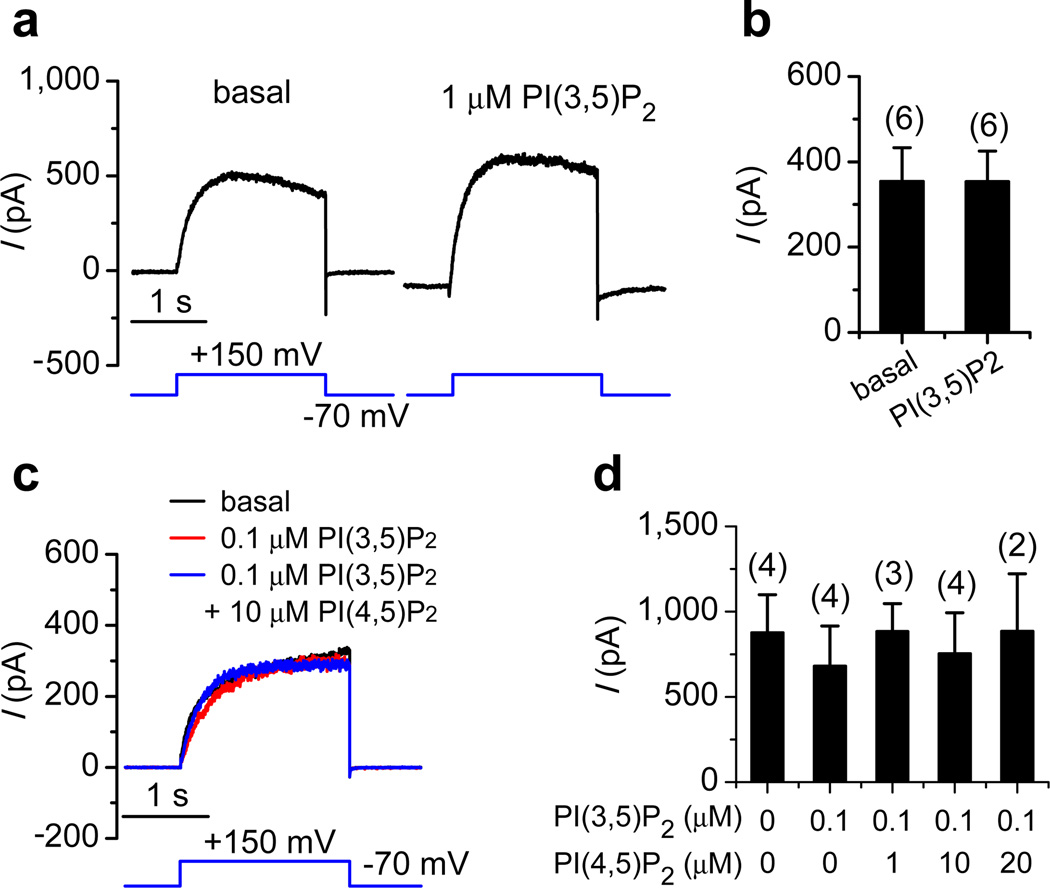Figure 6. TPC3 is insensitive to PI(3,5)P2 and PI(4,5)P2Endolysosomal currents were recorded from GFP-drTPC3-transfected HEK293T cells. Concentrations of PI(3,5)P2 and PI(4,5)P2 are indicated in the figure. (a) Representative current traces and (b) average current amplitudes in the absence (basal) or presence of PI(3,5)P2. (c) Representative current traces and (d) average current amplitudes in the absence or presence of PI(4,5)P2. Data are represented as mean ± s.e.m.