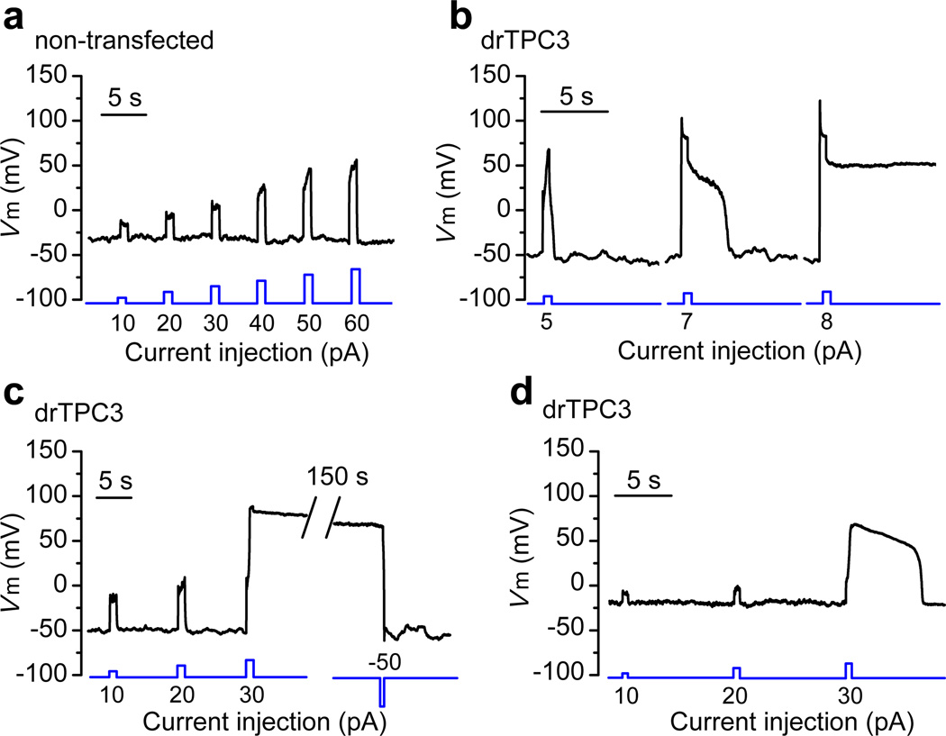 Figure 7. TPC3 supports ultra-long action potentials and membrane bistabilityRepresentative whole-cell current clamp recordings were performed in HEK293T cells without (a) or with (b–d) GFP-drTPC3 transfection. Depolarizing current injection stimuli (illustrated below each recording with the sizes indicated) were applied. ulAPs were elicited from resting membrane potentials of −50 mV in b and c, or −20 mV in d.