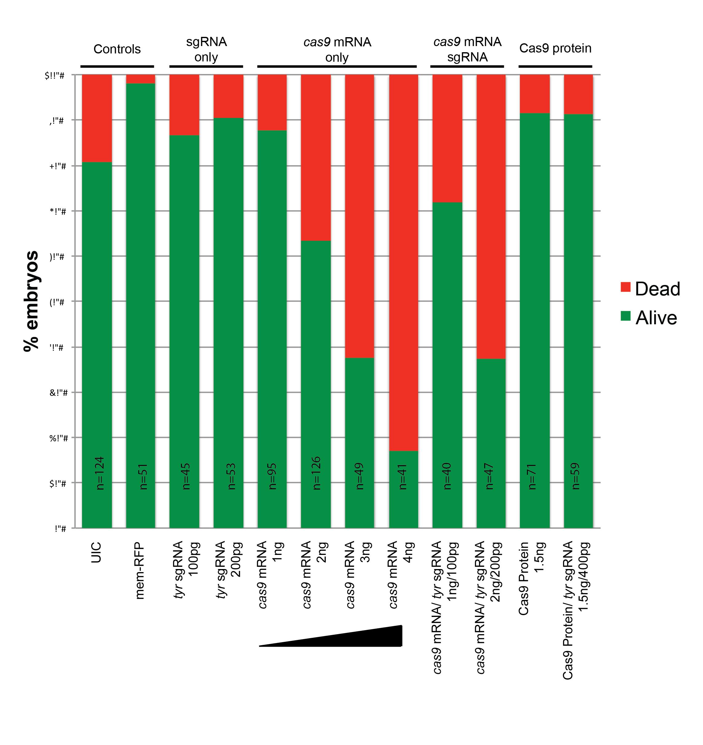 Supplemental Fig. 2. Toxicity graph comparing cas9 mRNA vs. protein. X-axis=different injection conditions, Y-axis=% embryos dead (red) or alive (green).