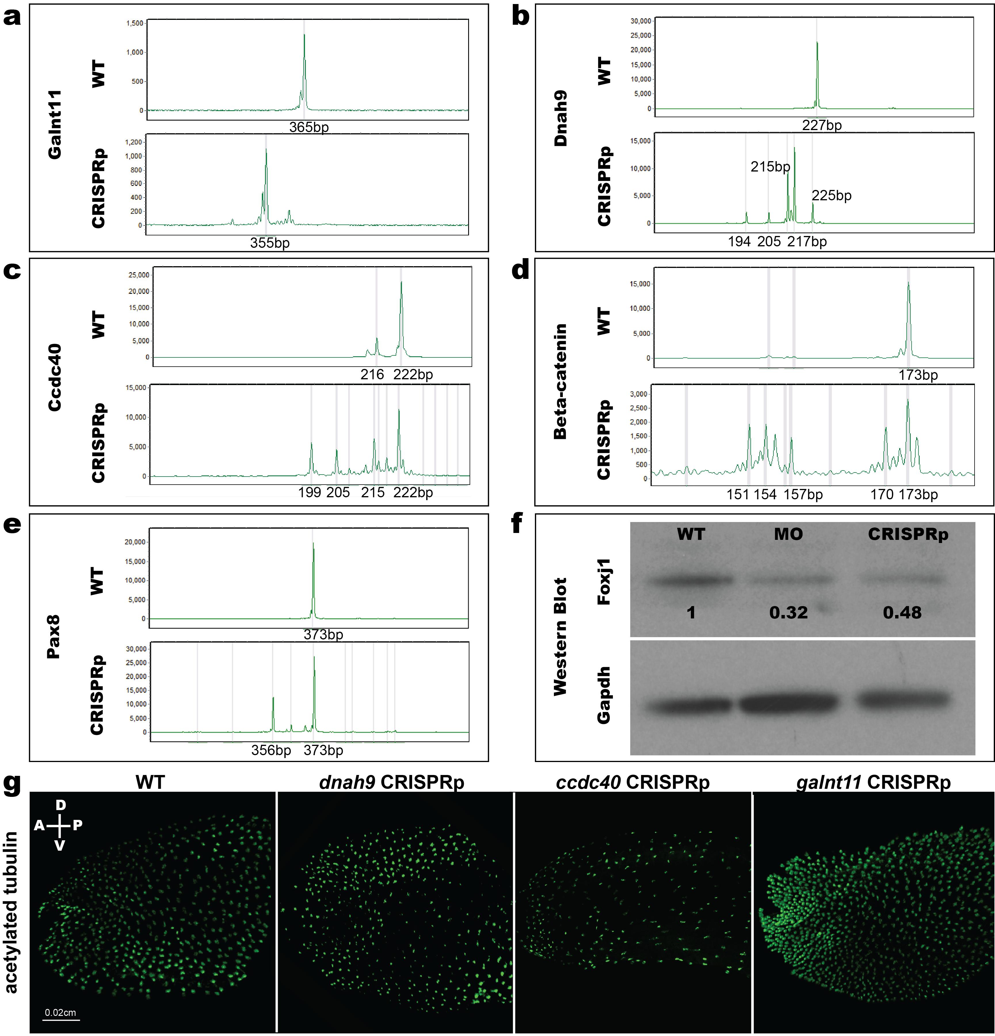 Supplemental Fig. 3. Examples of fragment analysis, western blot, and immunohistochemistry for various genes tested. FA genotype â X-axis=size of amplicon in basepairs (bp), Y-axis=relative intensity of PCR signal to loading control. (aâe) Fragment analysis of embryos injected with Cas9 protein+sgRNA â galnt11, dnah9, ccdc40, beta-catenin, pax8. (f) Western blot analysis using antibody against Foxj1. Quantification of changes in protein level was normalized to GAPDH and calculated using ImageJ software from NIH. (g) Immunohistochemistry of stage 28 embryos with acetylated tubulin to mark surface cilia. Left to right â WT, dnah9, ccdc40, and galnt11.