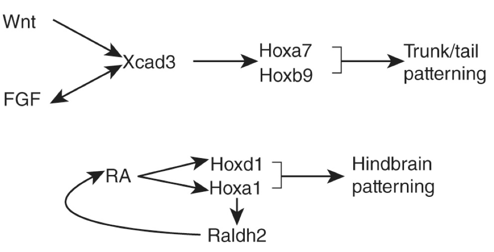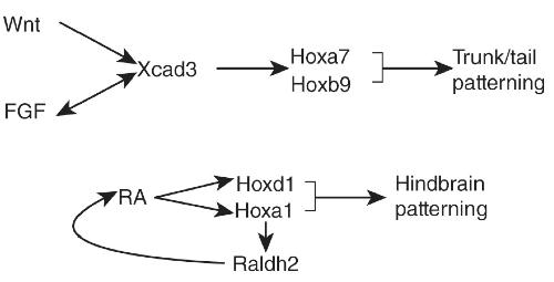 Regulatory networks involving Wnt, fibroblast growth factor (FGF), and retinoic acid (RA) in anteroposterior (AP) patterning. Xcad3 represents one of the transcriptional targets of later Wnt/ß-catenin signaling. It also forms a regulatory loop with FGF and participates in AP patterning of the trunk and tail regions through activation of Hoxa7 and Hoxb9 expression. In hindbrain patterning, there exits a feed-forward regulatory mechanism between Hox genes and RA synthesis. Hoxd1 is required for hindbrain patterning and may be a direct target of RA signaling, while Hoxa1 directly regulates the expression of Raldh2, which functions to increase RA concentration in the hindbrain region.