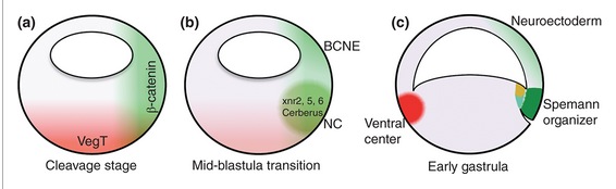Fig 1. pecification of the dorsoventral (DV) axis and formation of the Spemann organizer. (a) Cortical rotation following fertilization leads to the accumulation of Ã-catenin on the dorsal side, with maternal VegT localized to the vegetal hemisphere during cleavage stages. (b) The expression of Xnr genes is induced by VegT at mid-blastula transition. Ã-catenin also contributes to the induction of the higher levels of Xnr gene expression in the dorsal-vegetal cells. The Nieuwkoop center (NC) results in a combined activity of Nodal and Wnt/Ã-catenin signaling. The BlastulaChordin- and Noggin-Expressing (BCNE) center expresses maternal Wnt/Ã-catenin target genes along with Chordin and Noggin, and is required for brain formation. (C) The Spemann organizer is formed above the dorsal lip of blastopore at the early gastrula stage and comprises distinct cell populations including anterior endoderm (camel), prechordal mesoderm (turquoise), and chordamesoderm (dark green). These cells involute during gastrulation to underline the noninvoluting neuroectoderm (light green). An active ventralgastrula center (red) is formed on the opposite side of the Spemann organizer, which can be also represented by the entire nonorganizer mesoderm. Molecular interaction between the Spemann organizer and the ventralgastrula center patterns the mesoderm along the DV axis.