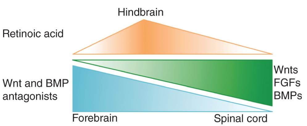 Endogenous morphogens gradients pattern the anteroposterior (AP) axis. In the anterior region, Wnt, fibroblast growth factor (FGF), bone morphogenetic protein (BMP), and retinoic acid (RA) signaling activity is kept low due to presence of negative regulators. An appropriate RA concentration is required for hindbrain patterning, and a high concentration of Wnt, FGF, and BMP specifies the posterior region (see text for detail).