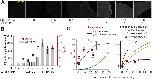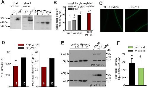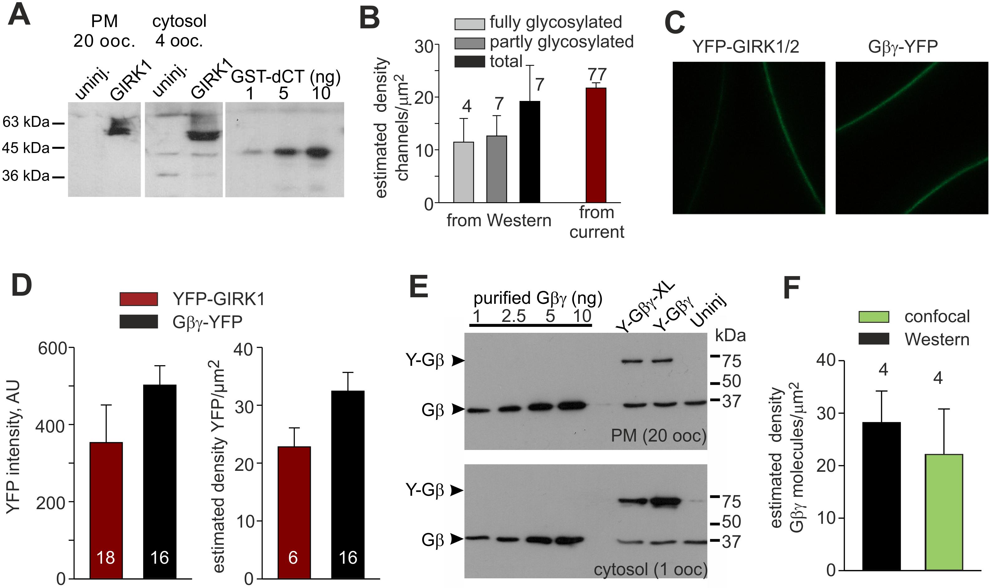 Fig 4. Measuring the surface density of GIRK1/2 and Gβγ in Xenopus oocytes. (A) Immunochemical estimation of the amount of GIRK1 in manually separated plasma membranes of Xenopus oocytes injected with 1 or 2 ng of GIRK RNA. Shown is a Western blot of 20 manually separated plasma membranes and 4 cytosols, and variable known amounts of the GST-fused distal C-terminus of GIRK1 (the antibody's epitope) used for calibration of the antibody-produced signal. There was a non-specific band at ~75 KDa in cytosols but not PM of uninjected oocytes (âuninjâ). (B) Summary of quantitative analysis of GIRK1 in PM from Western blots of 7 separate experiments. The fully glycosylated band was observed in 4 out of 7 blots. Molar amounts of protein and PM densities from Western blots were calculated as detailed in Methods. The dark red bar is the GIRK1/2 surface density in the high-density group estimated from Iβγ (see Table 1), shown for comparison. (C) Examples of confocal images of oocytes expressing YFP-GIRK1/2 (5 ng RNA) and Gβγ-YFP (5 ng RNA). (D) Estimating YFP molecules density in PM using YFP-GIRK1/2 as molecular ruler. A representative experiment is shown. The left plot shows the measured intensities of YFP-GIRK1/2 and YFP-Gβ coexpressed with wt Gγ in a separate group of oocytes (5:1 ng RNA). The right plot shows the PM densities of YFP in the YFP-GIRK1/2 oocytes, calculated as follows: Iβγ was 14.5±2.1 μA (n = 6), corresponding to 11.4±1.6 channels/μm2, or 22.8±3.3 YFP molecules/μm2. The density of YFP in the YFP-Gβγ expressing oocytes was calculated based on relative intensities from the left plot. (E) Estimating the amount of endogenous Gβ and expressed YFP-Gβ or YFP-Gβ-XL (5 ng RNA) coexpressed with wt-Gγ, in manually separated plasma membranes. Protocol was similar to Fig 4A; wt purified recombinant Gβγ was used for calibration. In parallel to biochemical measurements, we also measured GIRK currents and YFP intensity in 5â15 oocytes expressing either YFP-GIRK1/2-Gβγ or YFP-Gβγ, as explained in D. (F) Summary of YFP-Gβγ surface density measurements in 4 experiments by the two methods, quantitative Westerns and confocal imaging with YFP-GIRK1/2 as the molecular ruler. doi:10.1371/journal.pcbi.1004598.g004 |