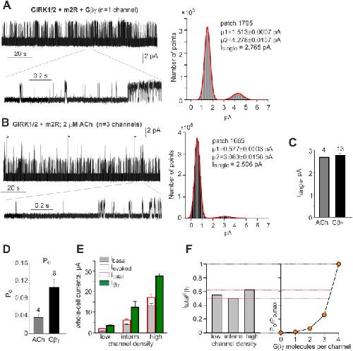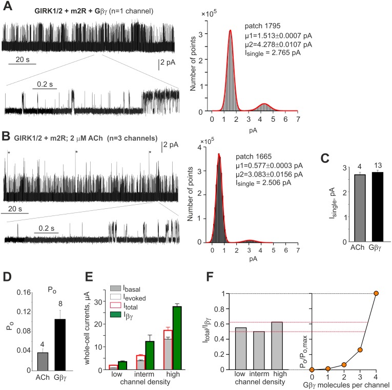 Fig 3. Single channel and whole-cell data reveal incomplete activation of GIRK1/2 by agonist compared to Gβγ.(A) Activity of GIRK1/2 in a cell-attached patch of an oocyte expressing the channel, m2R and Gβγ, without an agonist in the pipette. Right panel shows a 2 minutes segment of record, with zoom (below) on a shorter segment. The amplitude distribution histogram of the same 2 min-segment is shown on the right. Red line shows a two-component Gaussian fit. Isingle was determined as the difference between the fitted midpoints (μ) of the GIRK current peak on the right (μ2) and the left peak which corresponds to noise (μ1). (B) Activity of GIRK1/2 channels in a cell-attached patch of an oocyte expressing the channel and m2R and activated by 2 μM ACh present in the patch pipette. (Asterisks denote artifacts produced by capacity discharges of patch clamp headstage). The corresponding amplitude histogram of the 2 min-segment of the record is shown on the right. In A and B, GIRK1/2 was expressed at low densities (GIRK1, 10–50 pg RNA; GIRK2, 7–17 pg RNA) whereas RNAs of m2R (1–2 ng/oocyte) and Gβγ (5:1 ng/oocyte) were chosen to produce saturating concentrations of these proteins. Inward K+ currents are shown as upward deflections from zero level. In the traces shown, acquisition was at 20 KHz with 5 KHz analog filter. Very similar values of Isingle were obtained with 2 KHz filtering (not shown). (C) Single channel currents (left plot) are identical with either ACh or Gβγ. (D) Po is lower with ACh than with Gβγ (p = 0.029). Bars in C and D show mean±SEM, number of patches is shown above the bars. (E) Summary of whole-cell GIRK1/2 currents at three expression levels (densities). See Table 1 for details. (F) Left panel shows the Itotal/Iβγ ratios at three channel densities, calculated from data of Table 1. The right panel shows the fractional open probabilities of channels occupied by 0–4 Gβγ, same as in Fig 2C but in a simple graphic form. The red dotted lines are drawn to allow direct comparison of the experimental data from the left panel with the estimates of fractional Po from the right panel. |